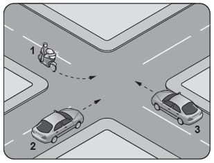 32. Şekle göre sola dönüş yapmak isteyen 1 numaralı motosiklet sürücüsü ne yapmalıdır?